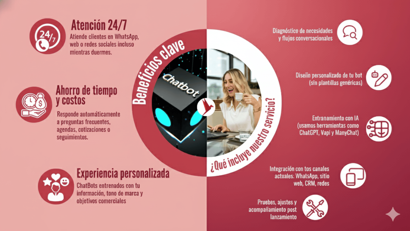 Atiende a tus clientes 24/7 en WhatsApp y Web. Entrenamos la IA con la información de tu negocio para responder con precisión y captar leads automáticamente.